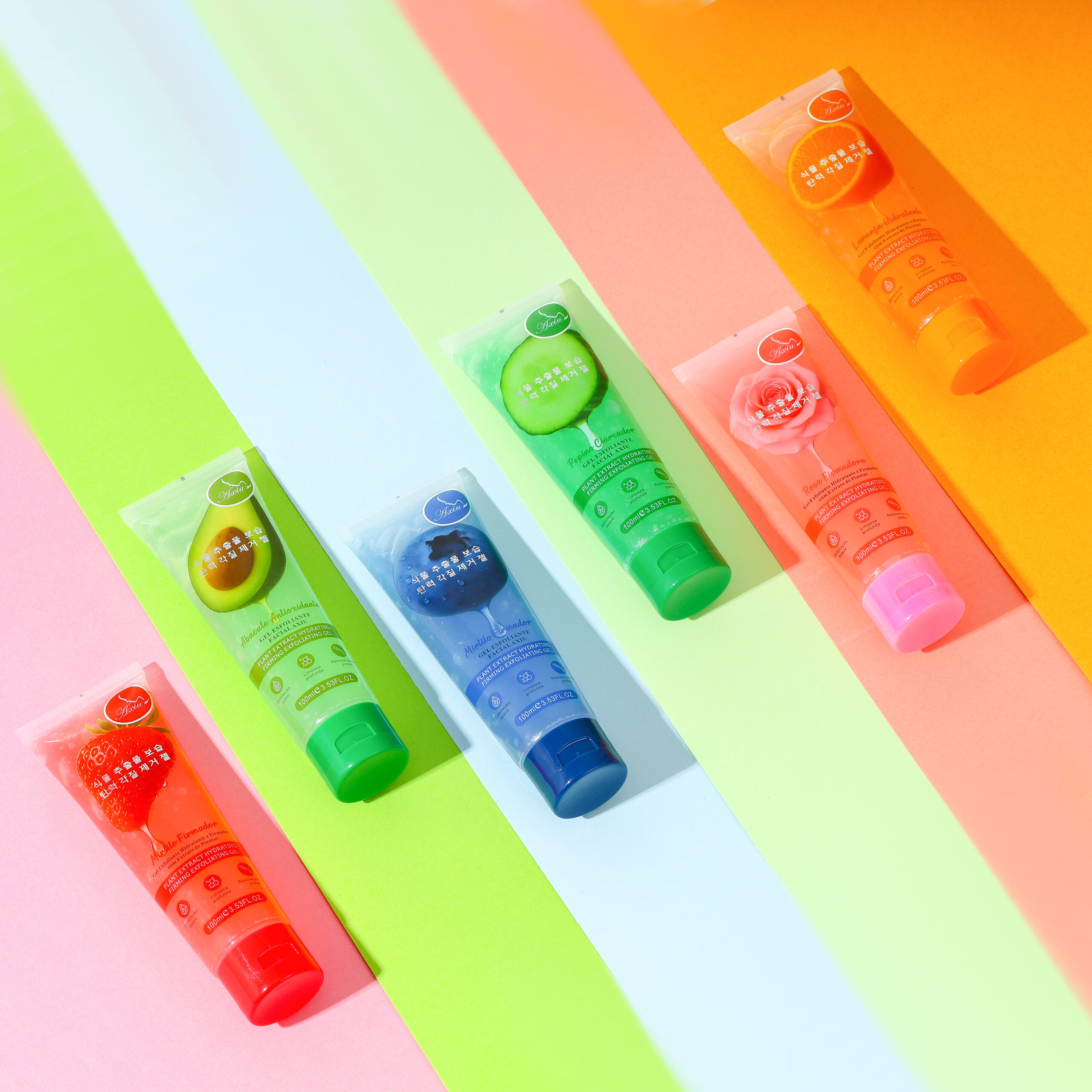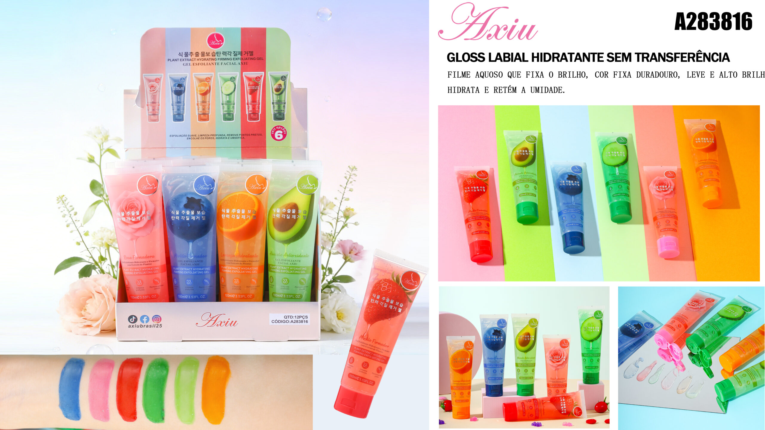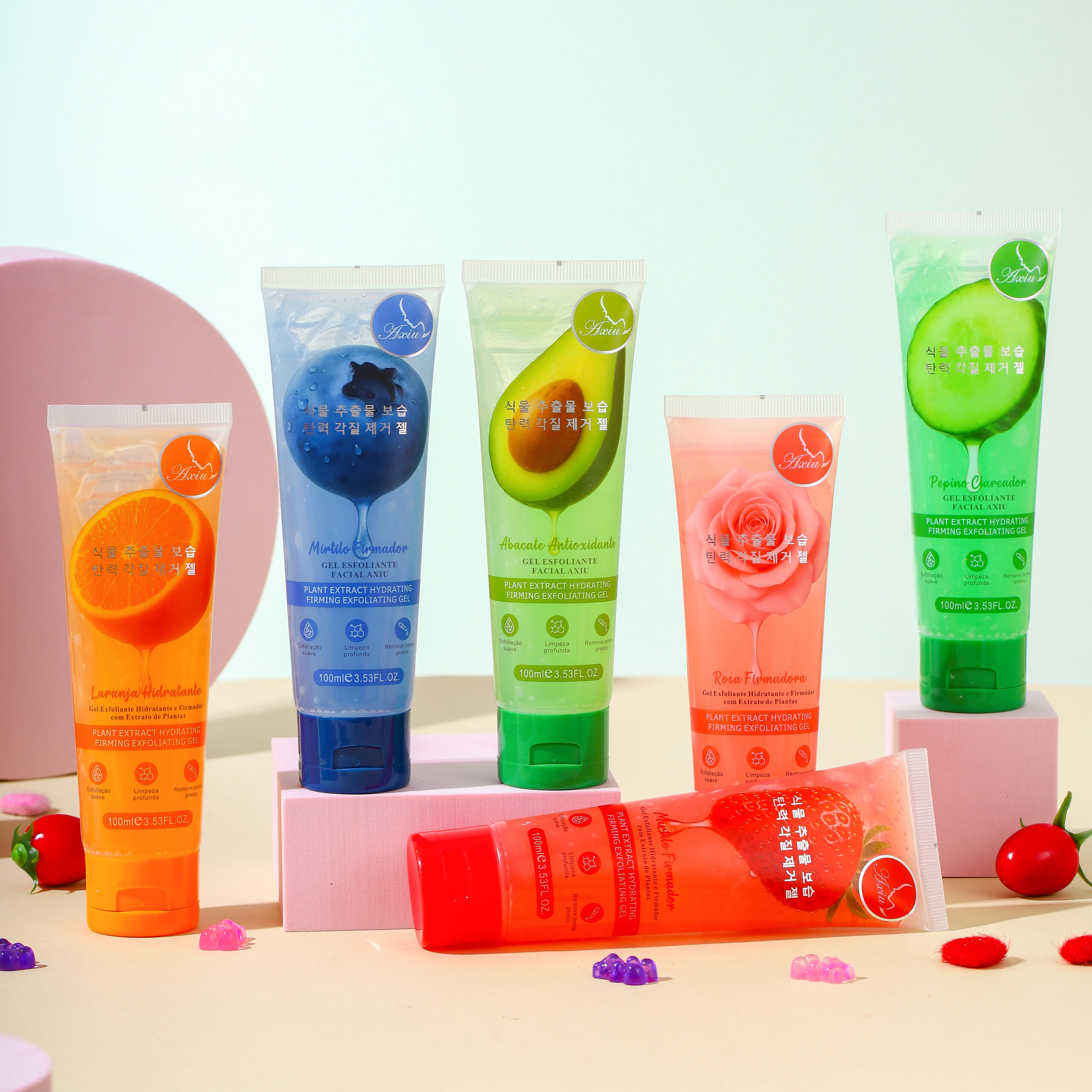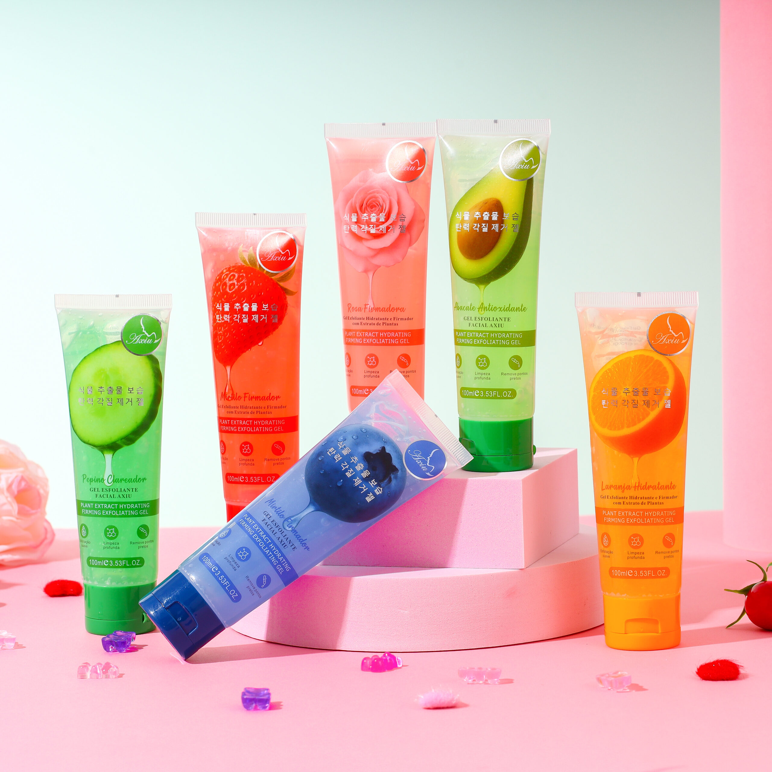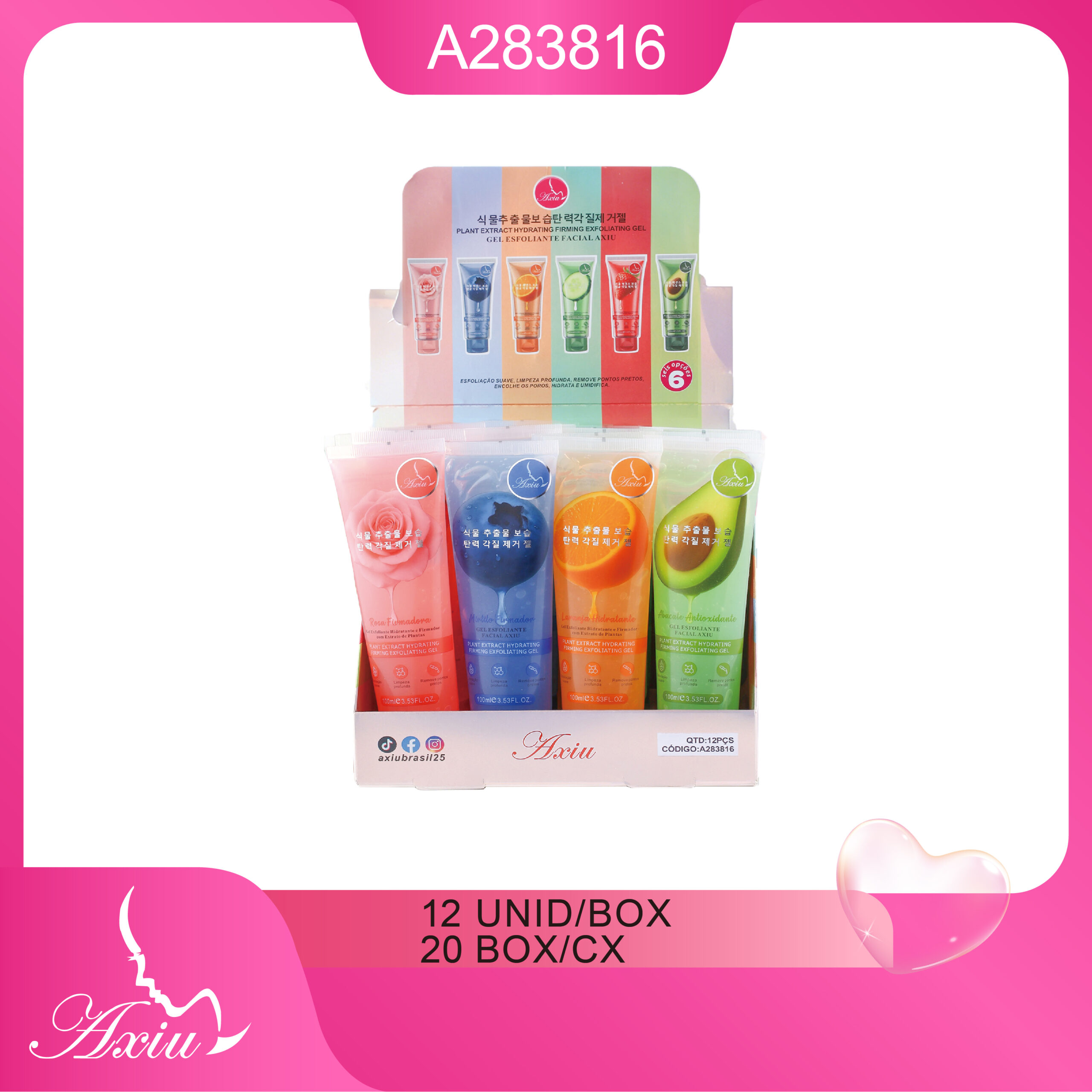 GEL ESFOLIANTE FACIAL AXIU: ESFOLIAÇÃO SUAVE, LIMPEZA PROFUNDA, REMOVE PONTOS PRETOS, ENCOLHE OS POROS, HIDRATA E UMIDIFICA. Seis opções disponíveis.